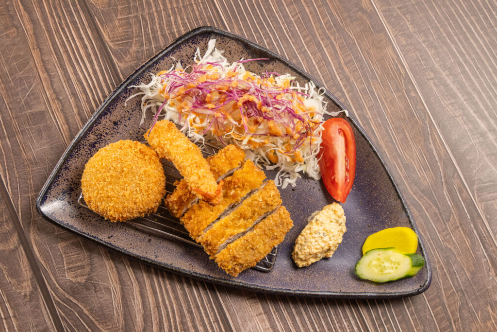 * Acompanhando o prato escolhido, o Teishoku oferece uma combinação balanceada e harmoniosa que inclui gohan (arroz branco), tonjiru (sopa de caldo de porco com legumes), tsukemono (conservas de vegetais) e salada.