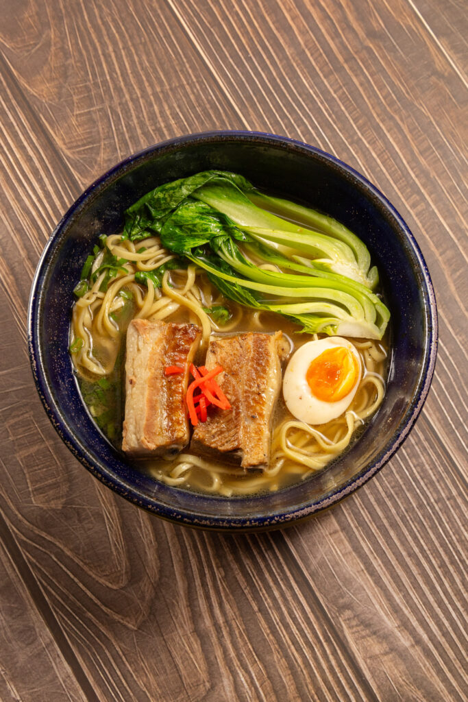 Sobá com costela suína, ovo cozido, acelga chinesa e caldo à base de frango. Uma deliciosa e reconfortante combinação de sabores tradicionais de Okinawa.